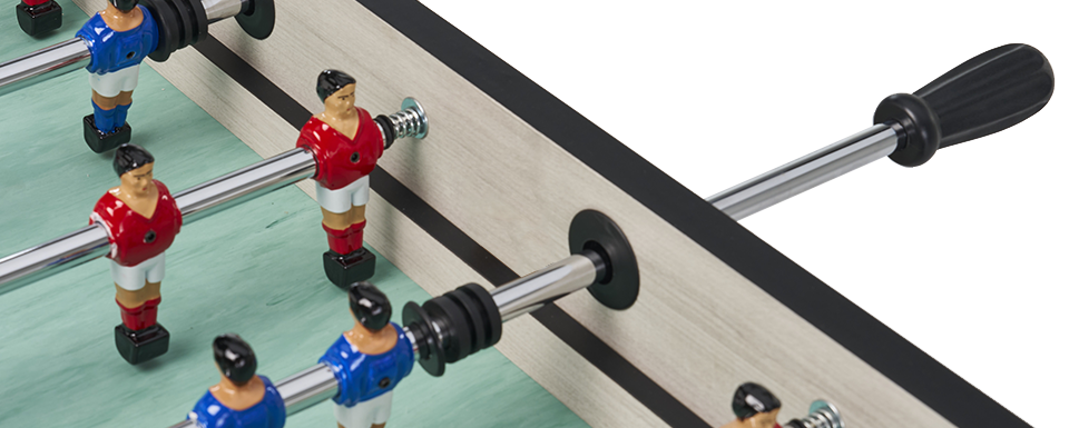 5. Vérification des parties mécaniques : Les barres, les poignées, les joueurs et autres pièces mécaniques du babyfoot nécessitent une attention régulière. Assurez-vous que les barres pivotent en douceur et que les poignées ne sont pas lâches. Si nécessaire, lubrifiez les pivots des barres avec un lubrifiant spécialement conçu pour assurer un mouvement fluide.
