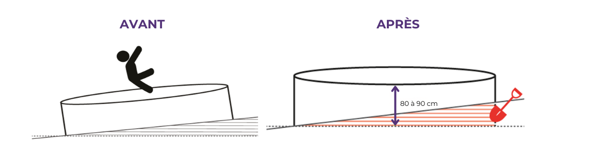 Si le sol est légèrement pentu : ➜ Creusez sous les pieds situés sur la partie la plus haute.