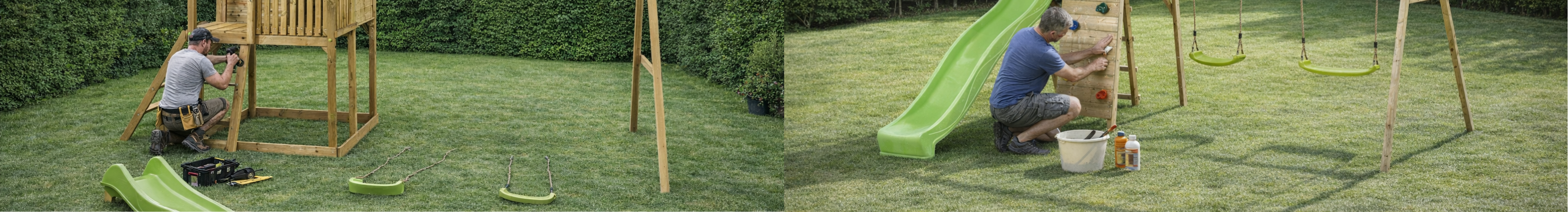 Les aires de jeux en bois séduisent par leur esthétique naturelle et leur capacité à s’intégrer harmonieusement dans un jardin. Le bois, lorsqu’il est traité autoclave, offre une excellente durabilité face aux intempéries et garantit une structure solide et stable. Il apporte également une sensation chaleureuse et authentique, très appréciée dans les espaces extérieurs familiaux.